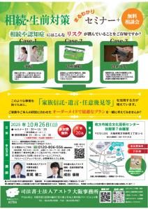 2025年10月26日(日) 枚方市 相続・生前対策セミナー開催 下記の日程でセミナーを開催します。