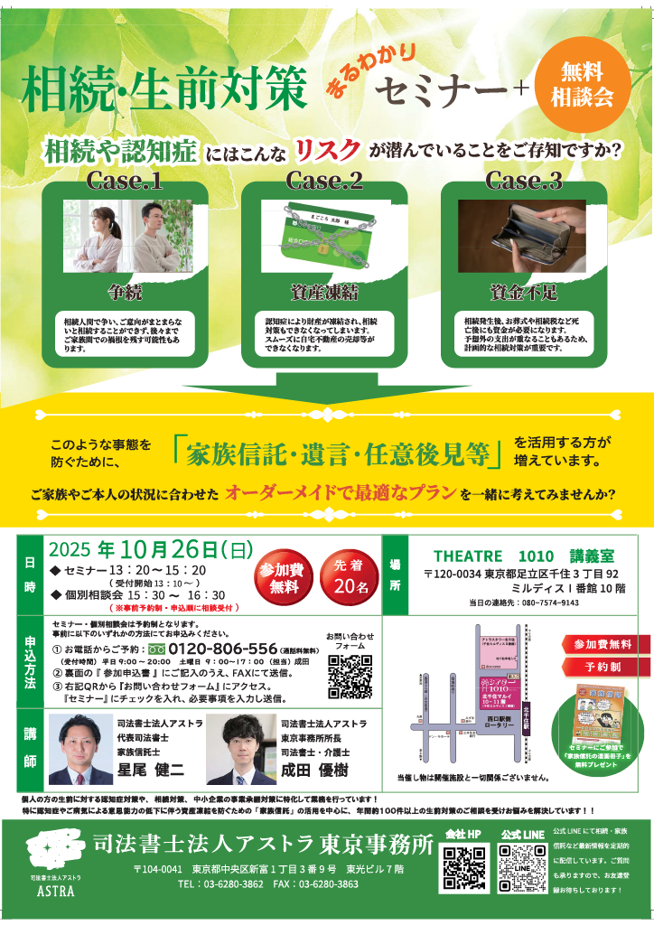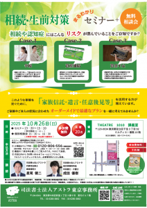 2025年10月26日(日) 北千住 相続・生前対策セミナー開催 下記の日程でセミナーを開催します。