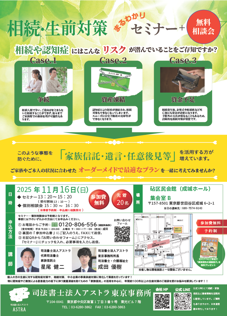 2025年11月16日(日) 成城にて相続・生前対策セミナー開催 下記の日程でセミナーを開催します。