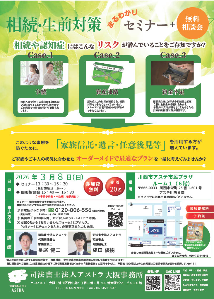 2026年3月8日(日) 川西市にて相続・生前対策セミナー開催! 以下の日程でセミナーを開催します。