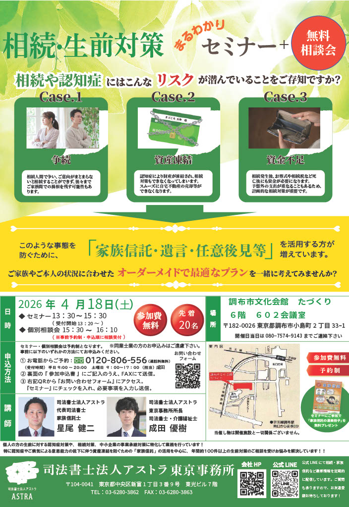 2026年4月18日(土) 調布市にて相続・生前対策セミナー開催! 以下の日程でセミナーを開催します。